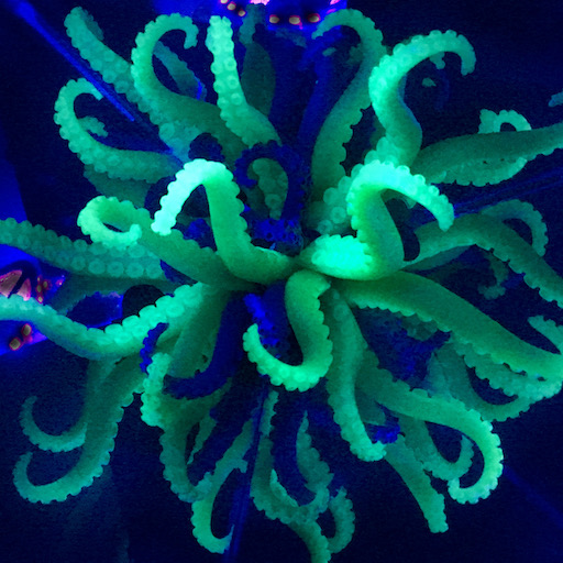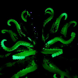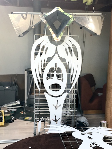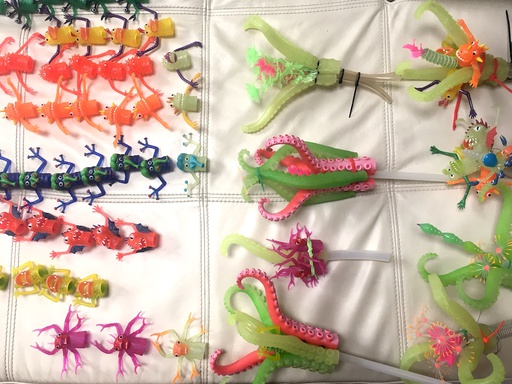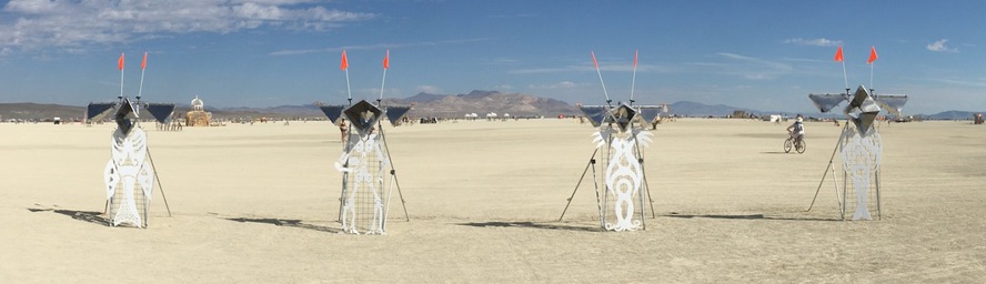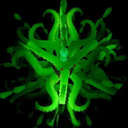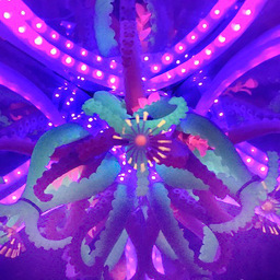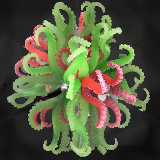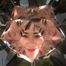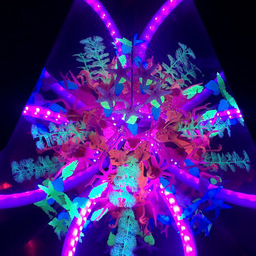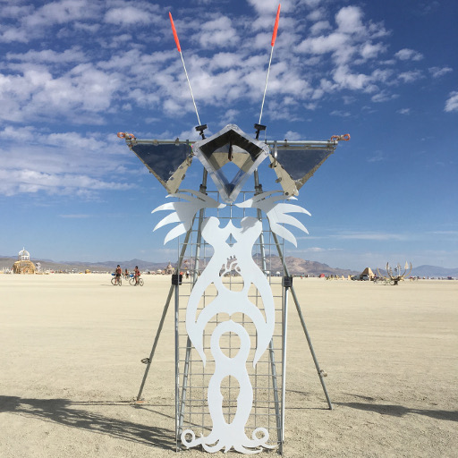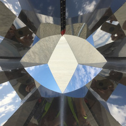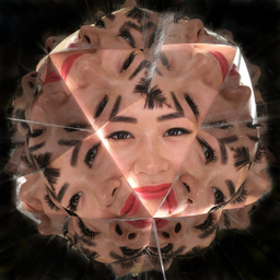 Atop each body, a system of interlocking mirrors multiplies the visitor's face into a 3D stellation, replete with many eyes, noses, and mouths -- omniscient, omnidirectional, and omnivorous. Side mirrors cover the 3D sphere with tessellated bouquets of tentacles and alien life forms.